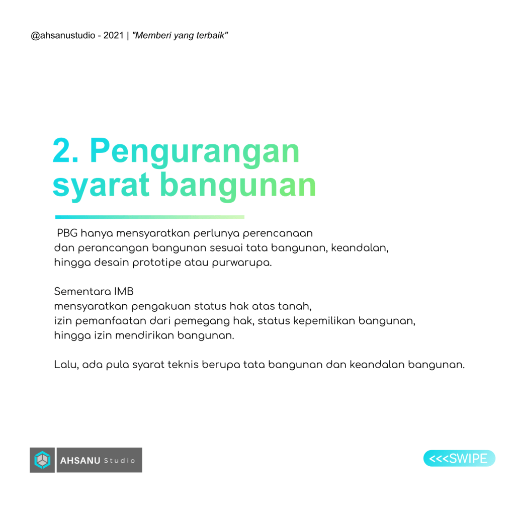 Saat ini, IMB telah diganti menjadi PBG. Secara garis besar perbedaan antara keduanya tidaklah berbeda jauh. Slide dibawah ini akan menjelaskan perbedaan IMB dan PBG sekaligus landasan hukumnya